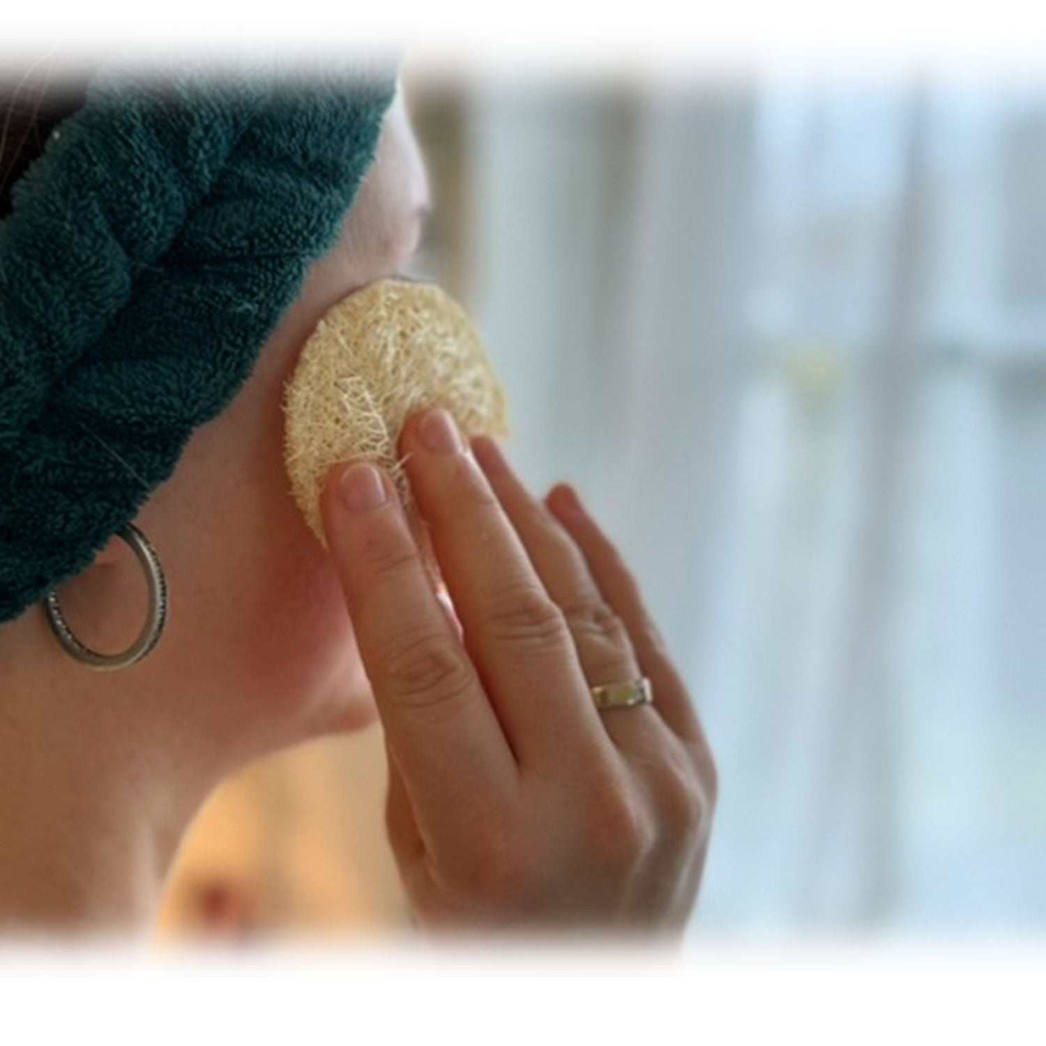 Almofadas esfoliantes de lufa, feitas com fibras 100 % compostáveis. Para uma esfoliação natural e saudável. Produção eco-certificada pela UE.